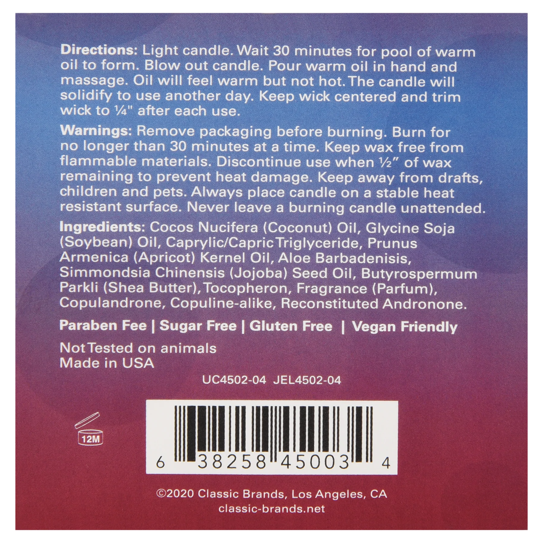 Light candle. Wait 30 minutes for pool of warm oil to form. Blow out candle. Pour warm oil in hand and massage. Oil will feel warm but not hot. The candle will solidify to use another day. Keep wick centered and trim wick to 1/4" after each use.