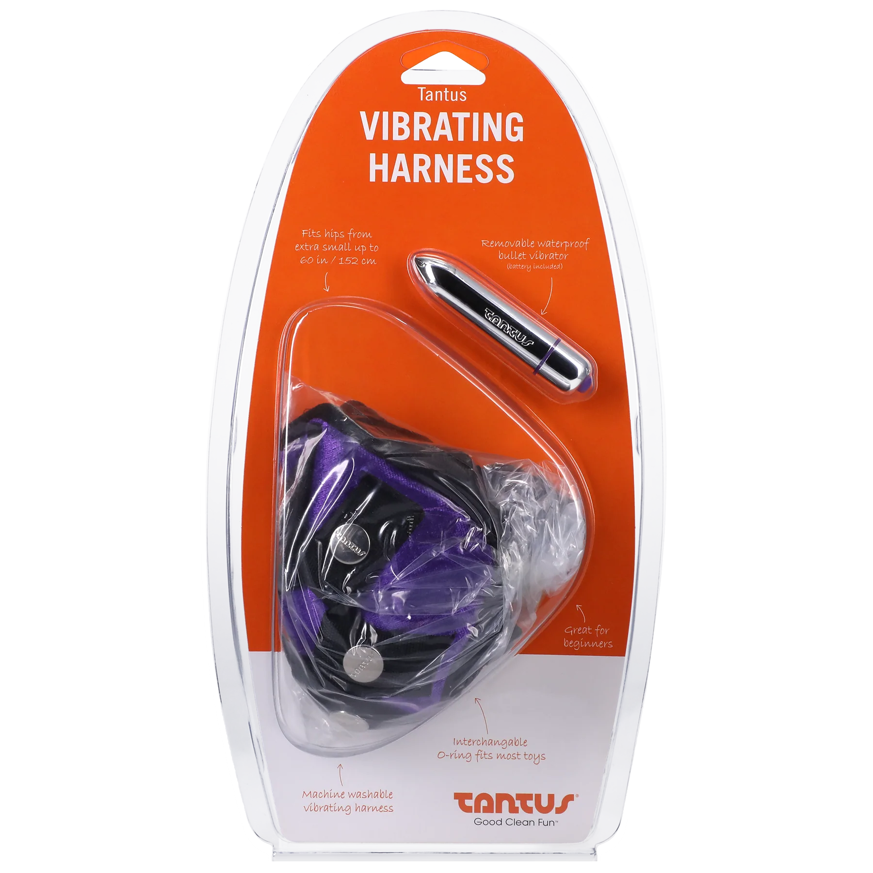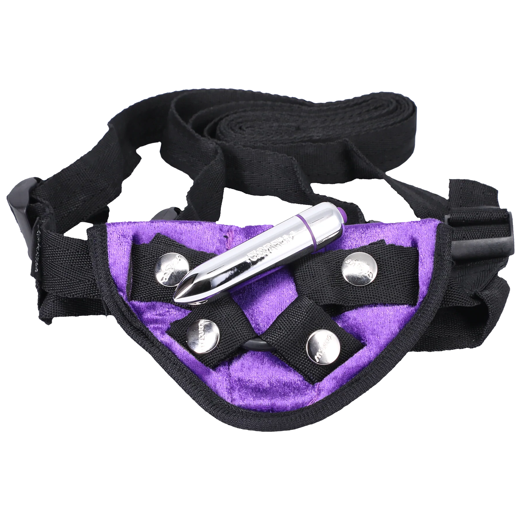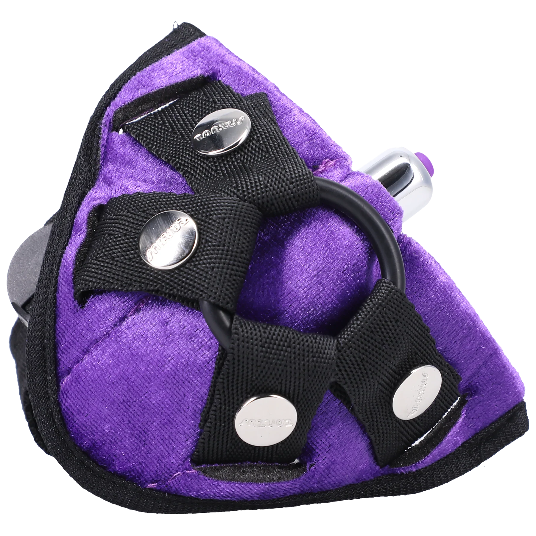 Tantus’ Velvet Vibrating Harness is the perfect accessory for strap on play beginners. The soft velvet material is soothing and sensual on the body. The adjustable, classic 4-way adjustable design allows for a customized fit providing maximum comfort whilst keeping the dildo in place. Tantus’ Velvet Vibrating Harness includes a removable 1.5" O-ring, to take different sized or shaped toys to accomodate leveling up your play. The waterproof One Touch Bullet Vibe slides into the front pad's channel, to give both giver and receiver pleasure. The Velvet Vibrating Harness can be worn comfortably over a non-erect penis & scrotum, too. Users suggest wearing underwear beneath the harness to keep the non-erect penis and scrotum, in place during use. The Harness is machine washable, when placed in a delicates bag, using mild detergent or you can handwash. Make sure to remove the bullet vibe prior to washing. Hang dryin the Harness is recommended.